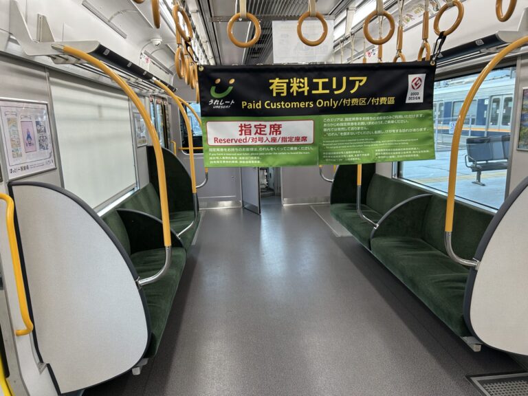 それらは全て車両単位で座席指定てあり、転換クロスシート、分かりやすく言えば進行方向に合わせて着席する椅子に座るのですが、東西線に入る快速電車は最後尾の車、車掌室前の14席が指定席となります。